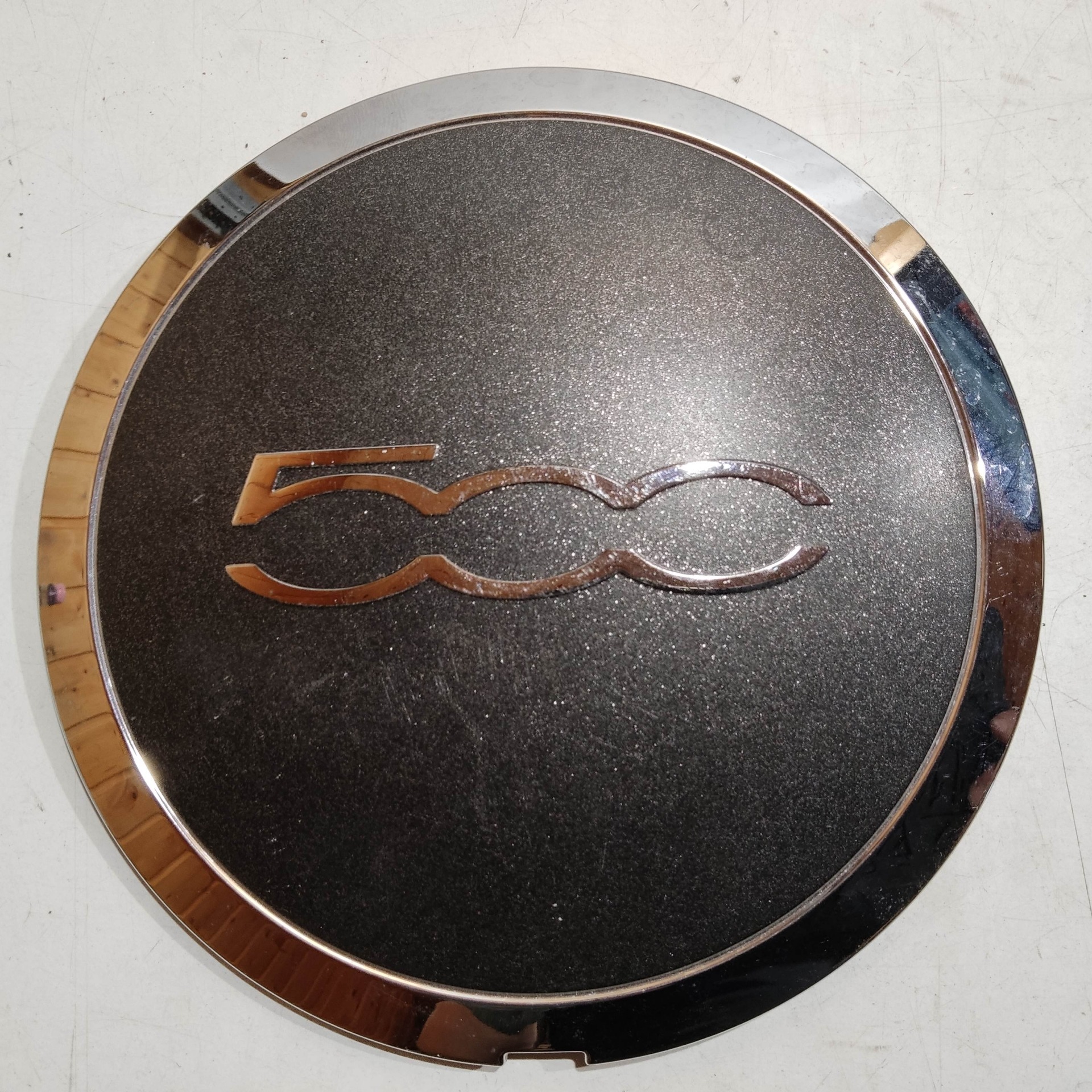 204471 Fiat 500 2007- felni közép kupak, a képen látható állapotban, kettő rögzítő fül törött, rögzítő rugó nélkül!!