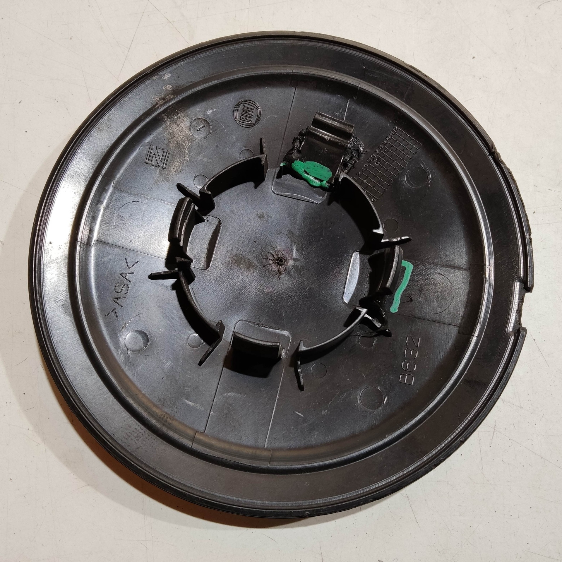 204474 Fiat 500 2007- felni közép kupak, a képen látható állapotban, kettő rögzítő fül törött, rögzítő rugó nélkül!!