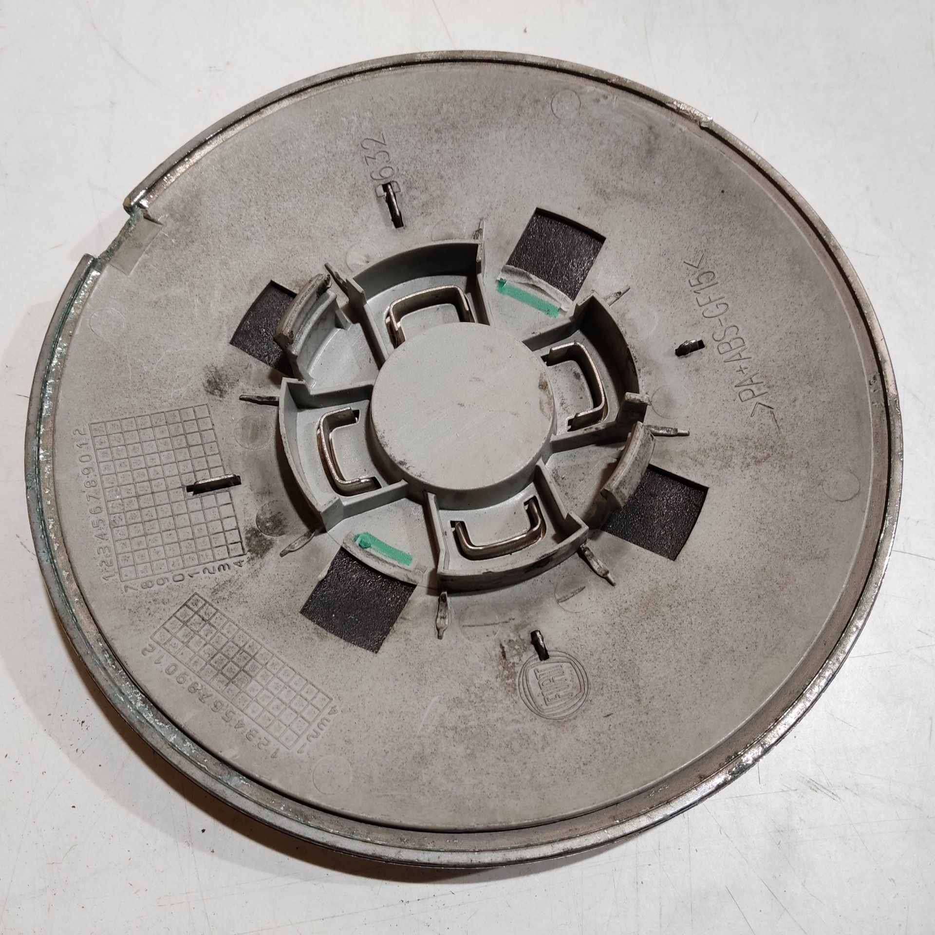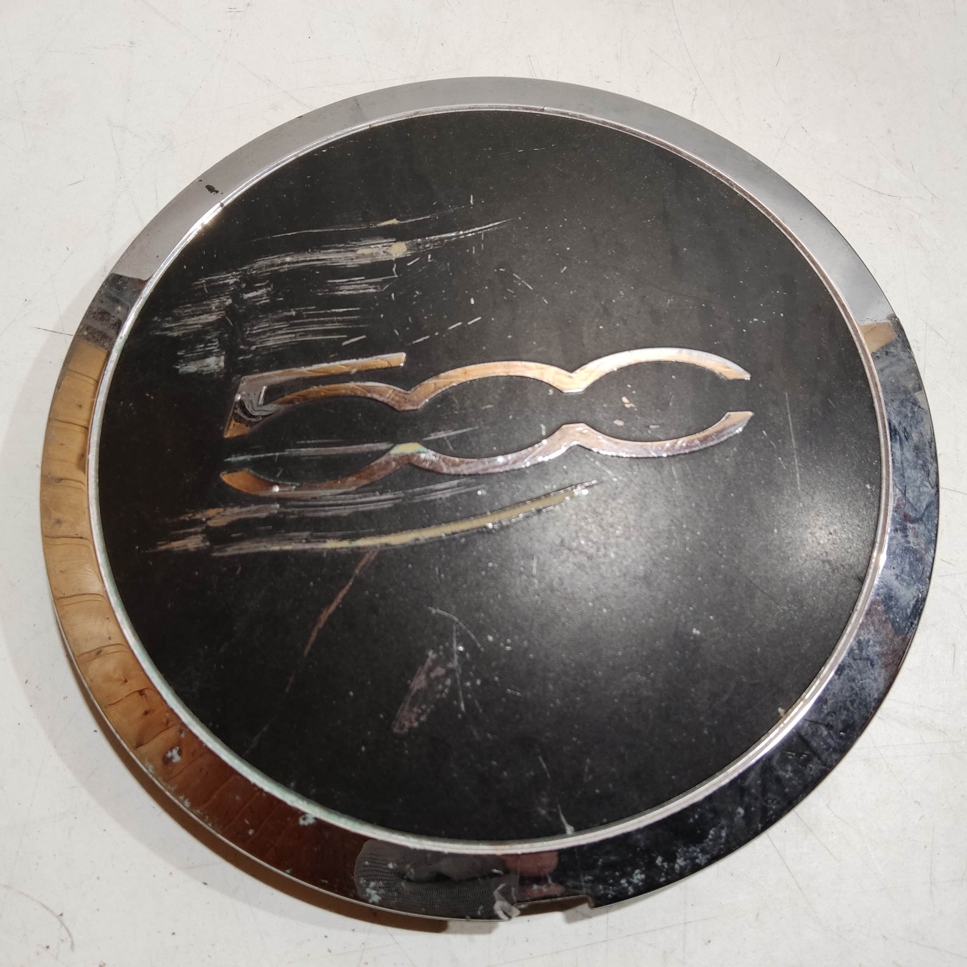 204480 Fiat 500 2007- felni közép kupak, a képen látható állapotban, kettő rögzítő fül törött, rögzítő rugó nélkül!!